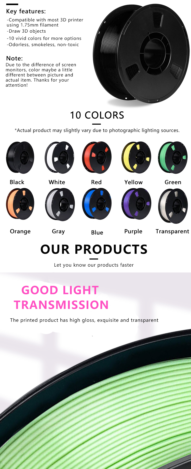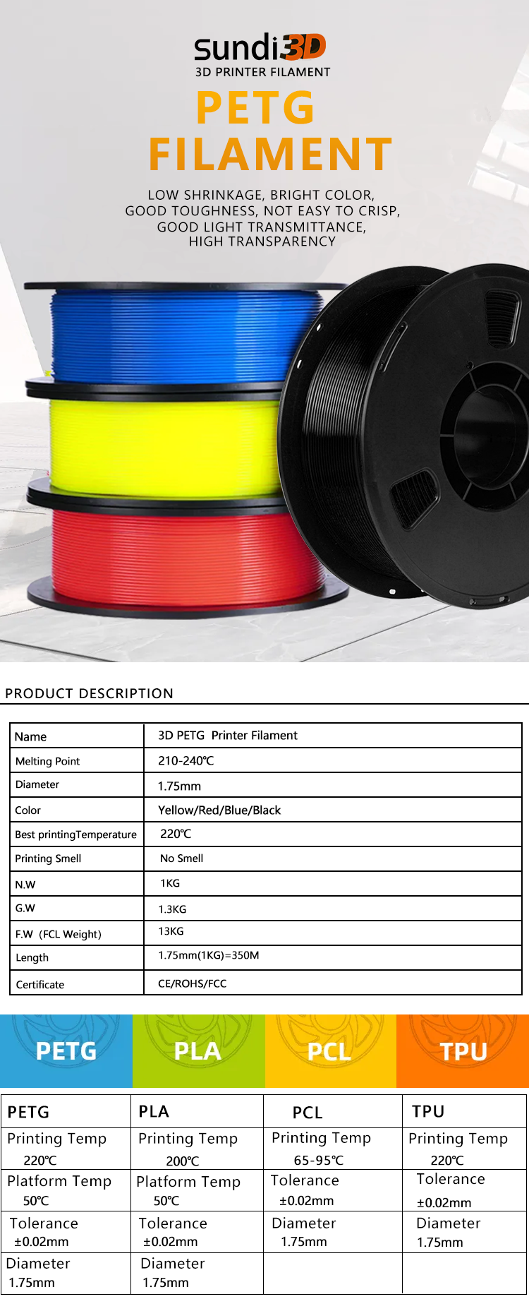 High-speed PETG filament uses 100% pure PETG, high quality, easy to print, less clogging, stunning printing results, PETG filament is more durable than any PLA because it is an engineering material with a glossy effect, therefore, it has excellent mechanical Support , high hardness and chemical resistance , etc.