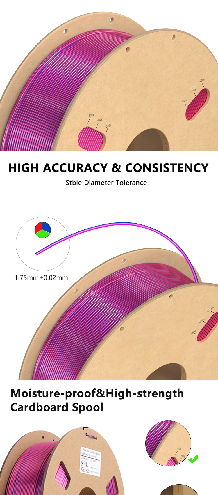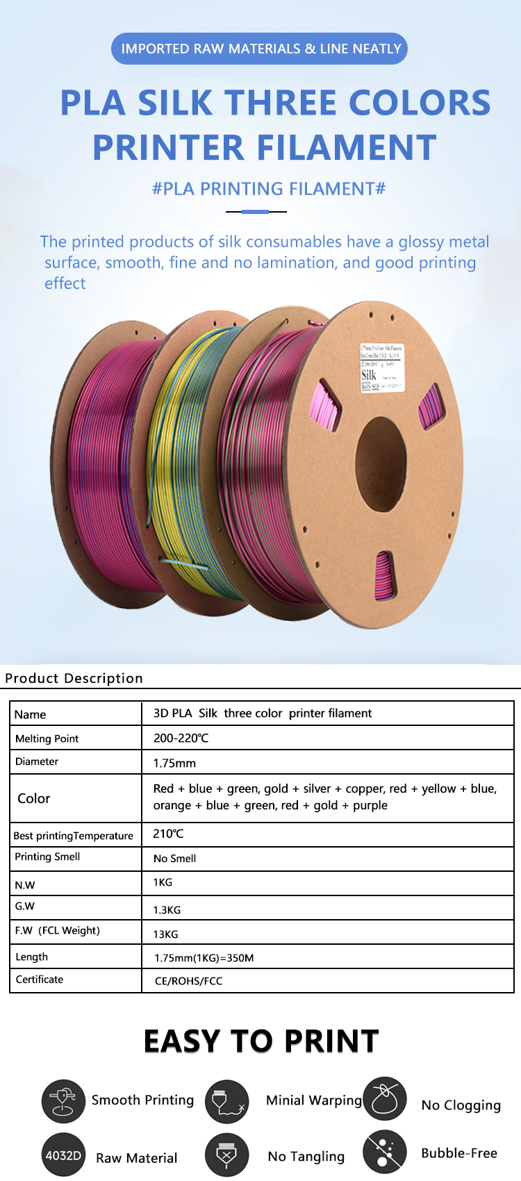 3. Wide compatibility: Three-color PLA filament is suitable for all types of FDM 3D printers. Whether you’re printing crafts, artwork, or industrial design samples, our consumables have you covered.